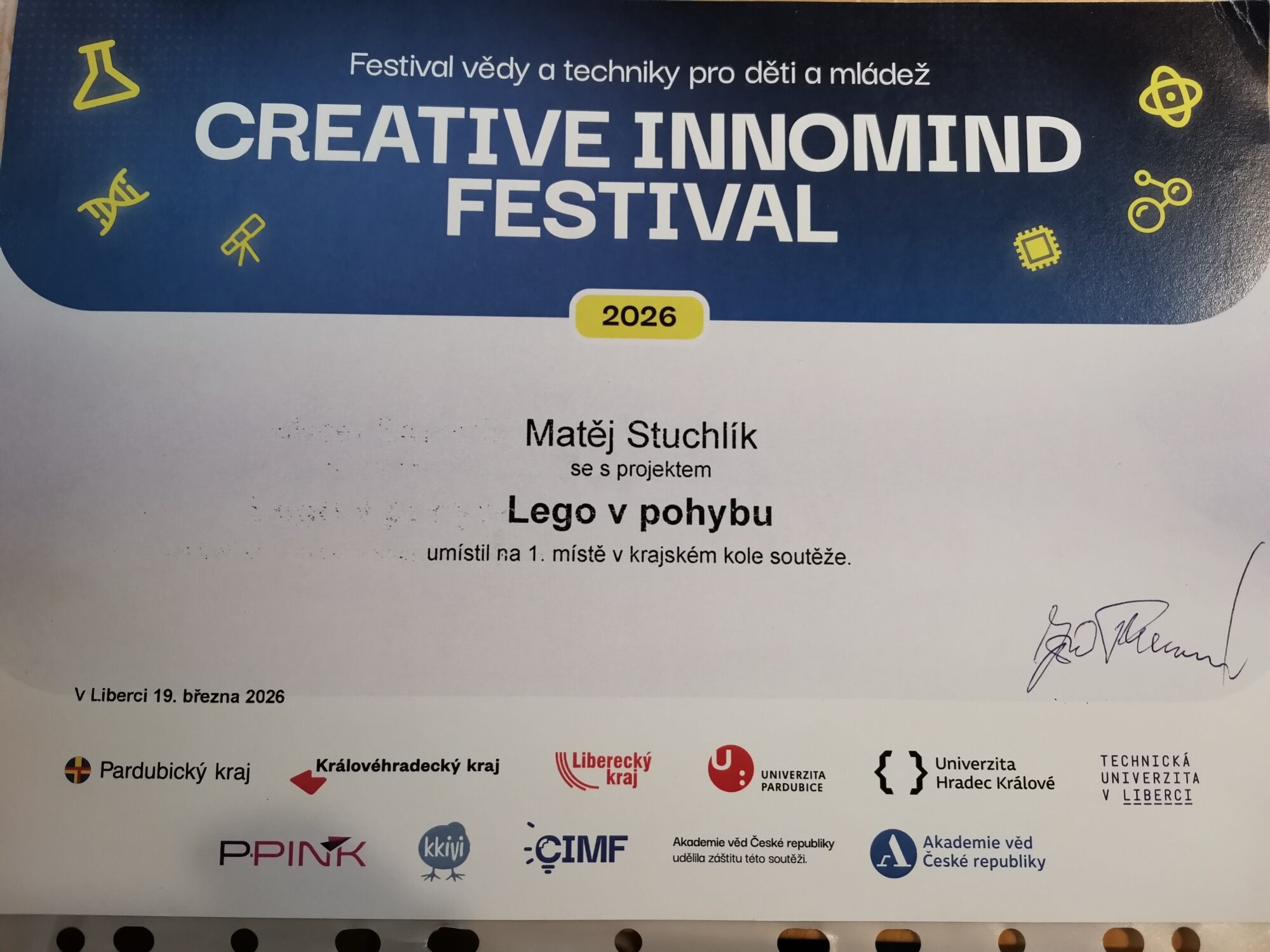 První místo na Festivalu vědy a techniky pro děti a mládež vybojoval mezi konkurencí se svým projektem Lego v pohybu Matěj Stuchlík ze 7. B. Gratulujeme Matějovi k nakročení ke slibné vědecké kariéře.